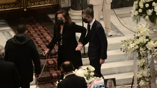 Μόλις μπήκε στην εκκλησία, υποβασταζόμενη από τον γιο της, Κώστα, έσπευσε συγκινημένη στους συγγενείς της Φώφης για να τους συλλυπηθεί, έχοντας μια αγκαλιά για τον άντρα και τα παιδιά της.