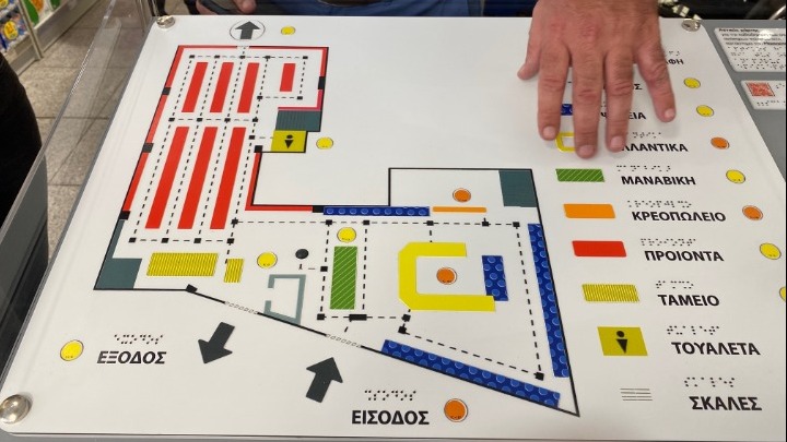 *Απτικοακουστικός χάρτης ο οποίος βρίσκεται μπροστά από τη reception του καταστήματος . Με τη χρήση γραφής μπραιγ καθώς και με τη βοήθεια ενός στυλού (pen friend) που μπορεί να διαβάζει φωνητικά, δίνεται στον αναγνώστη μια νοητική κάτοψη ολόκληρου του καταστήματος.