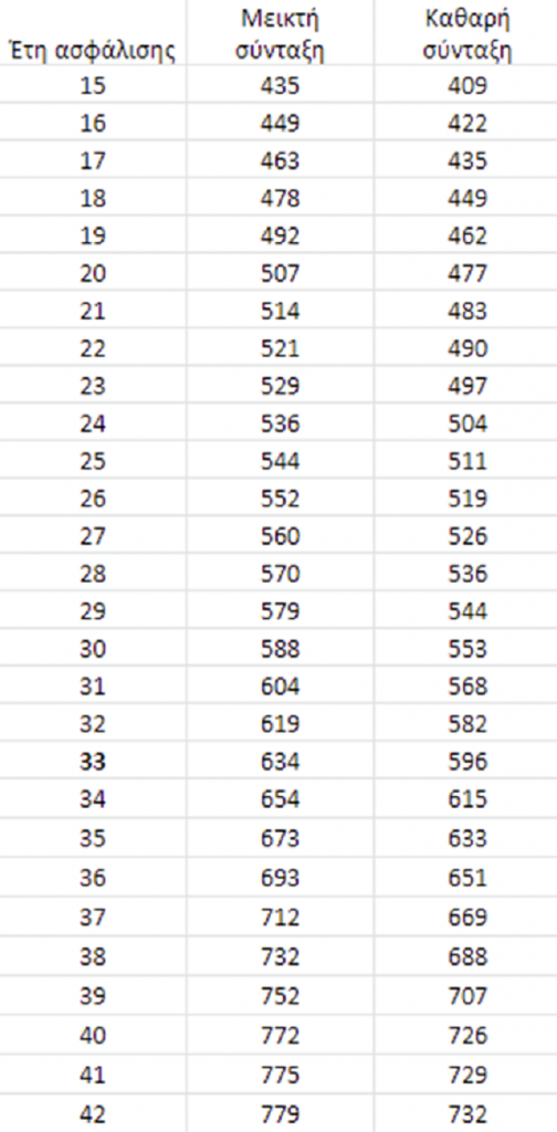 Ουσιαστικά, το σημαντικό είναι να διαμορφωθεί όσο το δυνατόν μεγαλύτερος μέσος όρος μέχρι τη συνταξιοδότηση. Για όποιον επιλέξει να παραμείνει καθηλωμένος στις ελάχιστες εισφορές, το μέλλον του ως συνταξιούχος είναι αυτό που αποτυπώνεται στον πίνακα που ακολουθεί: