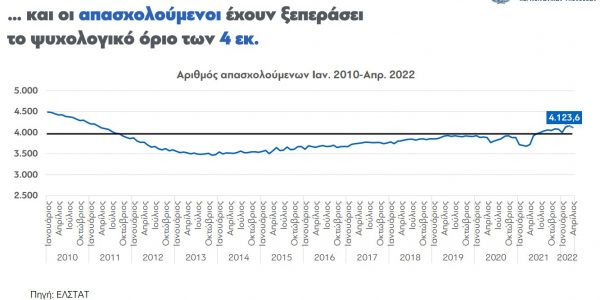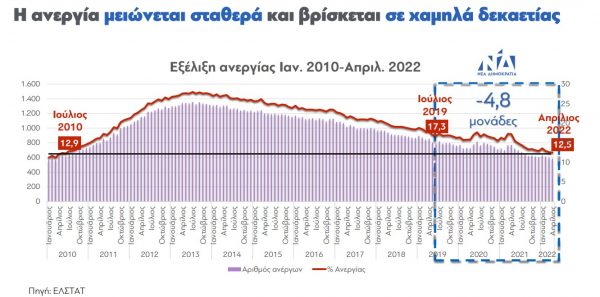Ο υπουργός Εργασίας κ. Κ. Χατζηδάκης – σε καθαρά προεκλογικό κλίμα – παρουσίασε στο τελευταίο υπουργικό Συμβούλιο τα στοιχεία από τα πεπραγμένα του υπουργείου του, σημειώνοντας ότι από τον Ιούλιο 2019, που ανέλαβε η κυβέρνηση της Νέας Δημοκρατίας μέχρι τον Απρίλιο του 2022 η ανεργία μειώθηκε κατά 4,8 μονάδες (από 17,3% σε 12,5%).