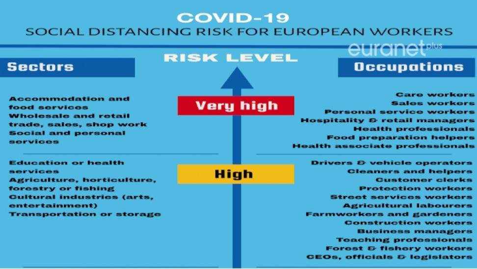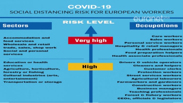 Τα μέτρα τήρησης κοινωνικής απόστασης, με τη σειρά τους, επηρεάζουν την τρέχουσα και μελλοντική εργασιακή απόδοση συγκεκριμένων επαγγελμάτων και κλάδων της αγοράς, με ό,τι αυτό σημαίνει για την επαγγελματική ευημερία εκατομμυρίων εργαζομένων στην Ελλάδα και συνολικά στην ενωμένη Ευρώπη.