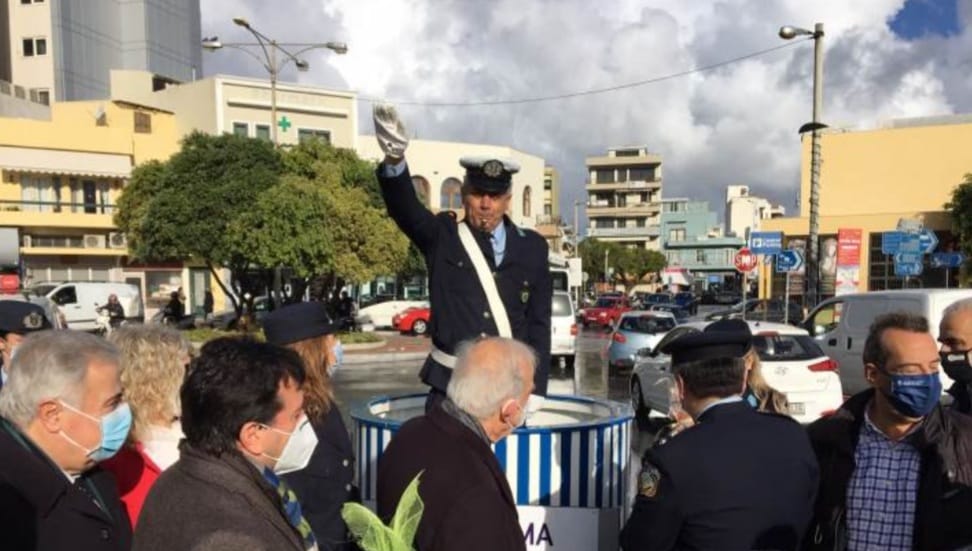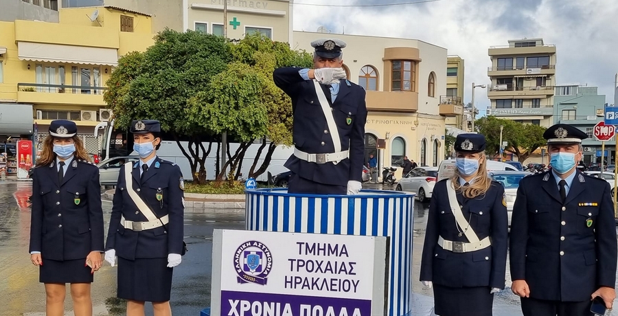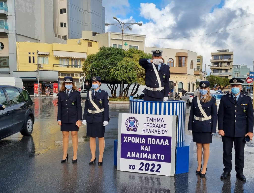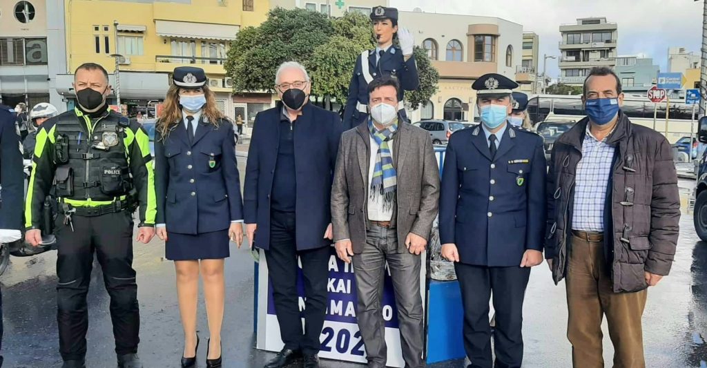 Ο Δήμαρχος δώρισε στον διοικητή της Τροχαίας Ηρακλείου Στέλιο Καρακούδη το καθιερωμένο καλάθι και ευχήθηκε στους άνδρες και τις γυναίκες που υπηρετούν στην Τροχαία: «Καλή χρονιά, με υγεία και όσο το δυνατόν λιγότερα ατυχήματα στους δρόμους».