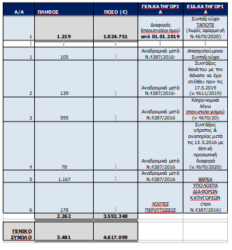 Με εμβόλιμη πληρωμή που πραγματοποιήθηκε στις 28/1/2022, η Διοίκηση του e-EΦΚΑ κατέβαλε το συνολικό ποσό των 4.617.099 € σε 3.481 συνταξιούχους διαφόρων κατηγοριών που δικαιούνται αναδρομικά ποσά και αποτυπώνονται αναλυτικά στον κάτωθι πίνακα: