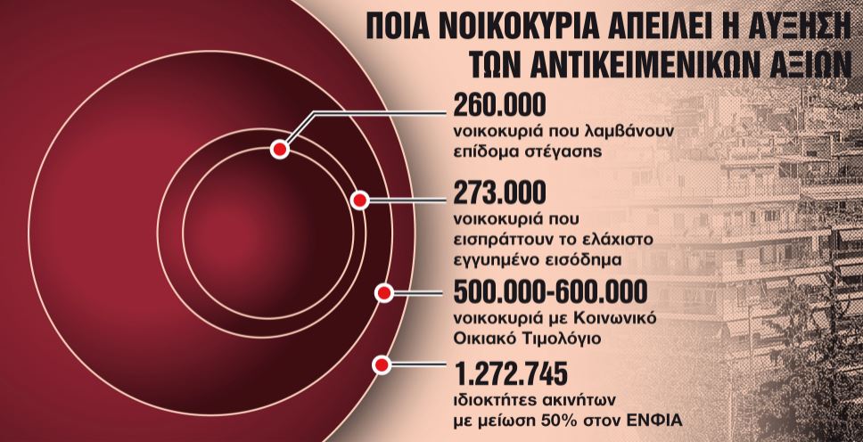 Το ύψος της αξίας της ακίνητης περιουσίας, σύμφωνα με το in.gr αποτελεί ένα από τα βασικά κριτήρια για τη χορήγηση του ελάχιστου εγγυημένου εισοδήματος, του επιδόματος στέγασης και θέρμανσης, αλλά και του μειωμένου οικιακού τιμολογίου της ΔΕΗ και της έκπτωσης 50% στον ΕΝΦΙΑ. Η αύξηση των αντικειμενικών τιμών θα έχει ως αποτέλεσμα η αξία των ακινήτων για πολλά νοικοκυριά να περάσει το όριο που ορίζει ο νόμος για τα επιδόματα, με αποτέλεσμα να χάσουν τις ενισχύσεις.
