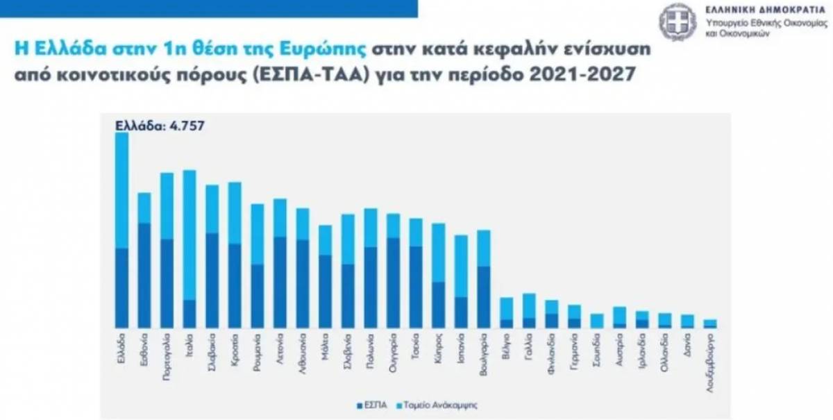 Συνδυαστικά, από το ΕΣΠΑ 2021-2027 και το Ταμείο Ανάκαμψης η Ελλάδα εξασφάλισε τους περισσότερους πόρους μεταξύ των «27» σε σχέση με τον πληθυσμό. Αντίστοιχα οι διαθέσιμοι πόροι από το Ταμείο Ανάκαμψης (δάνεια και επιδοτήσεις) για τη χώρα μας διαμορφώνονται στο 19,66 % του ΑΕΠ, ποσοστό που είναι το υψηλότερο μεταξύ των «27».