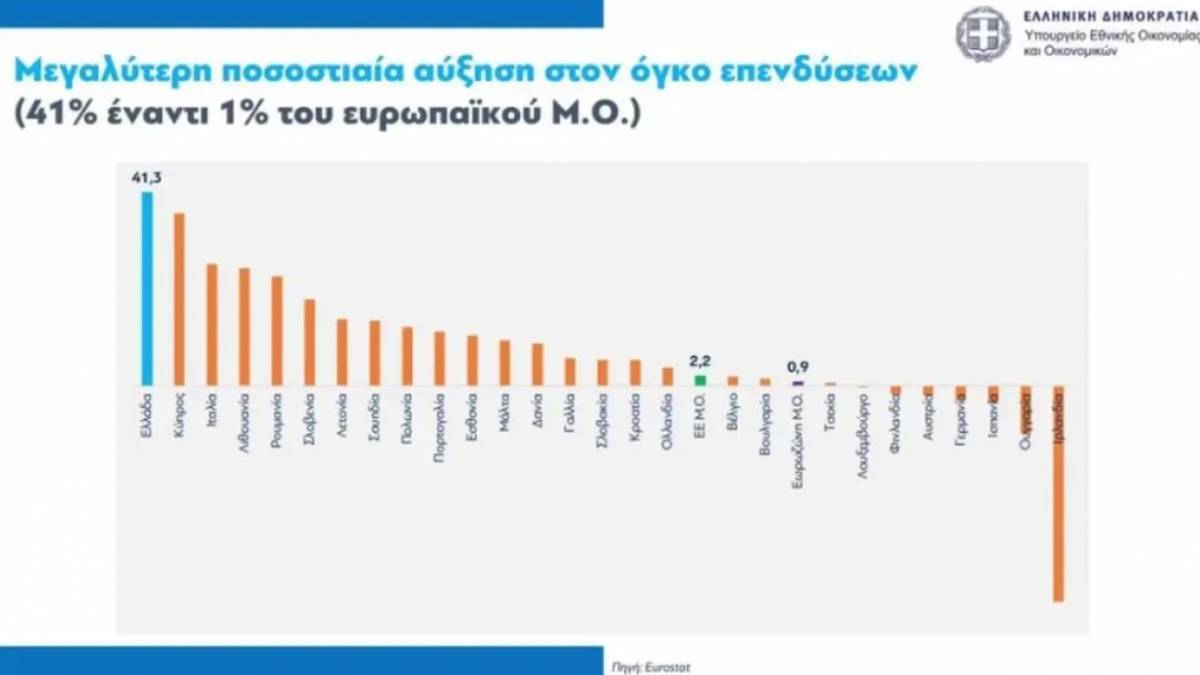Μεταξύ 2019 και 2023 η Ελλάδα παρουσίασε τη μεγαλύτερη ποσοστιαία αύξηση των επενδύσεων στην ΕΕ, με ποσοστό 41,3 % έναντι 1 % που ήταν ο μέσος όρος της ευρωζώνης.