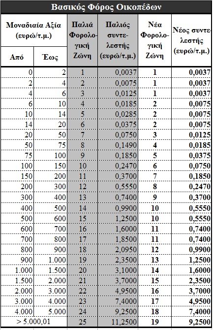 – για τιμή ζώνης από 1.501 έως 2.500 ευρώ ο συντελεστής διαμορφώνεται σε 3,70 ευρώ/τ.μ., ενώ με το ισχύον καθεστώς για τιμή ζώνης από 1.501 έως 2.000 ευρώ ο συντελεστής είναι 4,5 ευρώ/τ.μ. και από 2.001 έως 2.500 είναι 6 ευρώ/τ.μ.