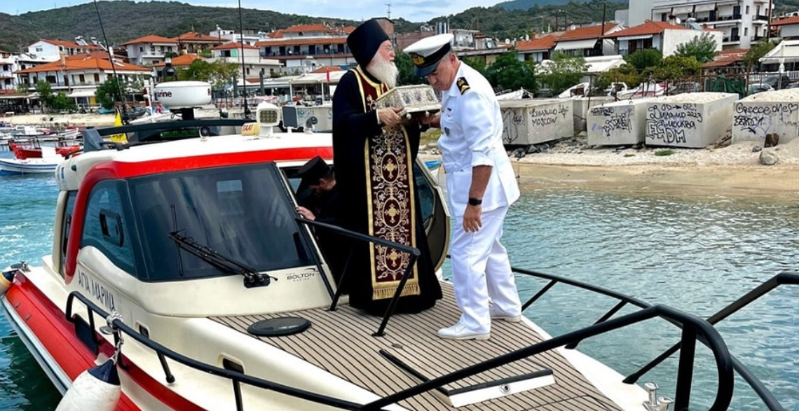 Στο λιμάνι της Ουρανούπολης πλήθος πιστών έσπευσαν να λάβουν την ευλογία και χάρη της Τιμίας Ζώνης, όπου ο γέροντας Εφραίμ κρατούσε στα χέρια του.