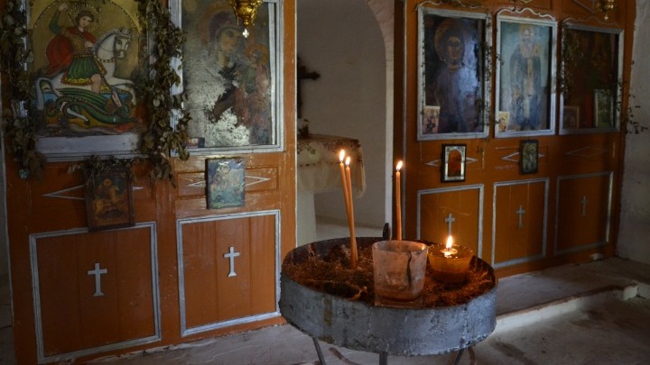 Με λίγες δάφνες στολισμένο το εικόνισμα του Άη Γιώργη, προσέχεις πως οι προσκυνητές -όσοι φτάνουν εδώ- θαρρείς κι αποφεύγουν να ασπαστούν την εικόνα. «Τι φοβούνται, μη κολλήσουν μια χαμένη αρρώστια;» ρωτάς τον οδηγό σου. «Είναι πολύ βαριά η μνήμη τούτου του χώρου. Με πολλές ιστορίες και ζωντανές ακόμα τις μαρτυρίες για αυτόν σαν τόπος συνώνυμος της κόλασης» σου απαντά.