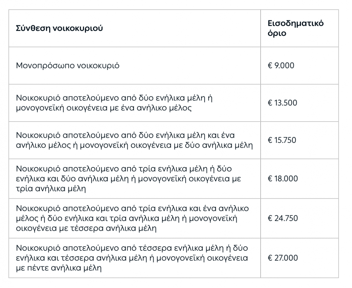 Για κάθε επιπλέον ενήλικο μέλος προστίθεται το ποσό των 4.500 ευρώ και για κάθε επιπλέον ανήλικο μέλος το ποσό των 2.250 ευρώ, μέχρι του συνολικού ορίου των 31.500 ευρώ ανεξαρτήτως του αριθμού των μελών του νοικοκυριού. Το συγκεκριμένο ανώτατο όριο (31.500 € ) αυξάνεται κατά 8.000 ευρώ για νοικοκυριό που στη σύνθεσή του περιλαμβάνει και άτομο ή άτομα με αναπηρία εξήντα επτά τοις εκατό (67%) και άνω και κατά 15.000 ευρώ για νοικοκυριό που στη σύνθεσή του περιλαμβάνει και άτομο ή άτομα που έχουν ανάγκη μηχανικής υποστήριξης με χρήση ιατρικών συσκευών, η οποία παρέχεται κατ’ οίκον και είναι απαραίτητη για τη ζωή τους.