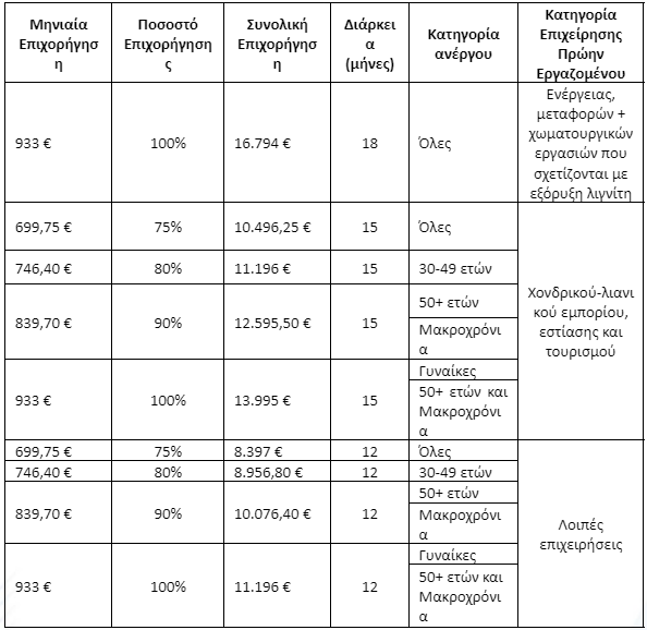 Η διάρκεια του προγράμματος είναι 12-18 μήνες, το ποσοστό επιχορήγησης μισθού και εισφορών κυμαίνεται μεταξύ 75-100%, ενώ το ποσό επιχορήγησης κυμαίνεται από 700 € έως 933 € μηνιαία και από 8.397 € έως 16.794 € συνολικά, ανάλογα με την κατηγορία του ανέργου και του κλάδου της επιχείρησης που εργαζόταν. Στην επιχορήγηση του μισθολογικού και μη μισθολογικού κόστους συμπεριλαμβάνονται δώρα εορτών και επίδομα αδείας.
