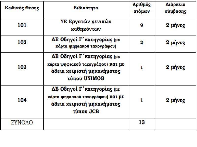 Η ανακοίνωση αναφέρει μεταξύ άλλων ότι ο Δήμος προχωρά στην πρόσληψη προσωπικού µε σύµβαση εργασίας ιδιωτικού δικαίου ορισµένου χρόνου, συνολικού αριθµού δεκατριών (13) ατόµων, για την ενίσχυση της πολιτικής προστασίας (αντιµετώπιση επειγουσών και σοβαρών αναγκών) , για τις εξής κατά αριθµό ατόµων ειδικότητες, µε τα αντίστοιχα τυπικά προσόντα και την αντίστοιχη διάρκεια σύµβασης: