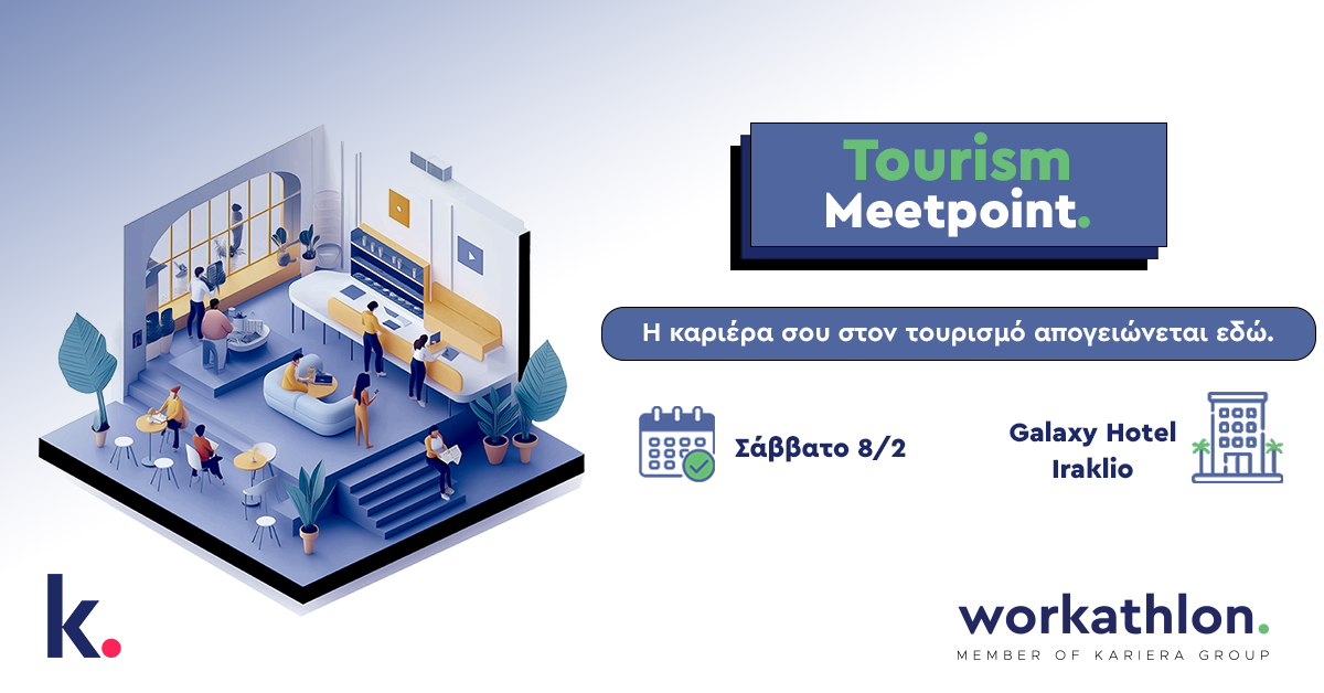 Το kariera.gr, το μεγαλύτερο hub για την εργασιακή ζωή στην Ελλάδα, σε συνεργασία με τη Workathlon, μέλος του Kariera Group, διοργανώνει για πρώτη φορά στο Ηράκλειο της Κρήτης,  το Tourism Meetpoint, την Πέμπτη 8 Φεβρουαρίου.