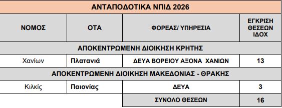 Το ΥΠΕΣ εγκρίνει την πρόσληψη δεκαέξι (16) ατόμων με σχέση εργασίας ιδιωτικού δικαίου ορισμένου χρόνου, διάρκειας έως οκτώ (8) μήνες, σε υπηρεσίες ανταποδοτικού χαρακτήρα στους φορείς του παρακάτω πίνακα: