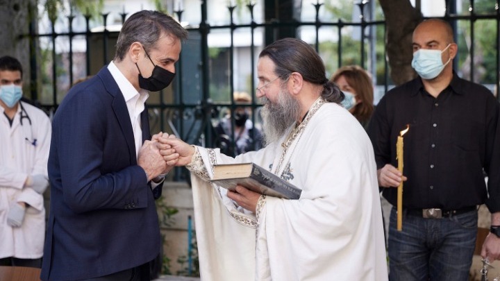 Ο πρωθυπουργός Κυριάκος Μητσοτάκης συνοδευόμενος από τον γιο του, Κωνσταντίνο, παρακολούθησε την Ακολουθία του Επιταφίου στον Ιερό Ναό του Ευαγγελιστού Λουκά, παρεκκλήσιο του Γενικού Νοσοκομείου Αθηνών «Ιπποκράτειο».